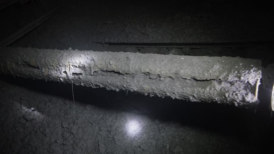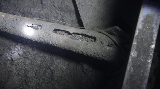 5。二号大倾角胶带运煤上山起火点及附近情况。–75m联络巷上方25m回程托辊处线缆未见明显过火,回程胶带钢丝绳断裂、燃烧痕迹明显;火源点胶带燃烧痕迹分界线明显,火源点上方胶带挡煤护板(胶带板)燃烧痕迹分界线明显;原躲身硐室(胶带侧)2.5m(长)×1.8m(高)×2m(深),未见可燃物;现场勘查发现起火点位于–75m联络巷上方25m,附近有4根回程托辊卡死,其中3根被磨穿的回程托辊中2根内部沉积粉煤,1根内部无积尘、无水、无渣(内部积尘被烧失,确认为起火点),另1根上表面有被磨平情况。回程托辊规格尺寸为:Ø133×1150,管径Ø133mm,壁厚4mm,材质为20#钢管;–75m联络巷到+5m联络巷区间大倾角运煤上山内胶带输送机巷帮和胶带下方,大量煤矸堆积;起火点回程托辊上方5m处为上、下行胶带断开位置,断开位置以上行胶带燃烧后仅剩钢丝绳,上、下行胶带钢丝绳断口明显;上行胶带断落后,下端掉到–150m联络巷附近挤压堆积,下方胶带未燃烧;下行胶带掉落到–75m联络巷位置以下,下段下行胶带未燃烧;起火点回程托辊内侧钢丝绳橡套有明显小缺口,该处正对一躲避硐室,硐室内可燃杂物均无燃烧、过火痕迹,该处以上5m内燃烧过火情况明显存在分界痕迹。