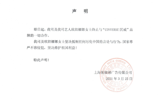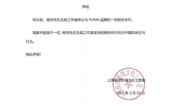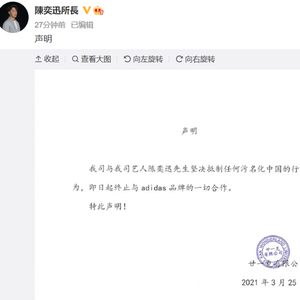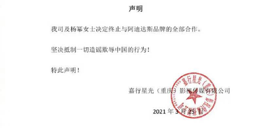 3月25日下午,杨幂、迪丽热巴、邓伦、王嘉尔、陈立农、易烊千玺、彭于晏、Angelababy(杨颖)、陈奕迅、向佐方面发布声明,宣布终止与阿迪达斯的一切合作。