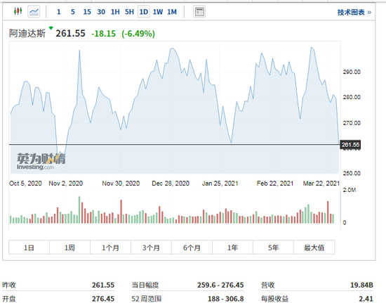 阿迪达斯25日在德国法兰克福交易所跌逾6.49%,报261.55欧元,单日流通市值蒸发约35亿欧元,约合270亿人民币。