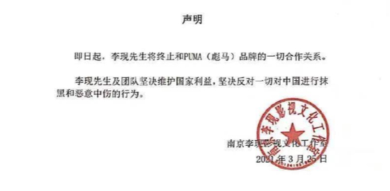 李现、杨洋、刘昊然终止与PUMA的合作。