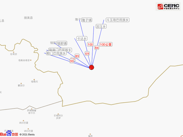 周边县城。震中距错那县90公里、距隆子县100公里、距措美县160公里、距朗县171公里、距曲松县177公里,距山南市210公里,距拉萨市282公里。