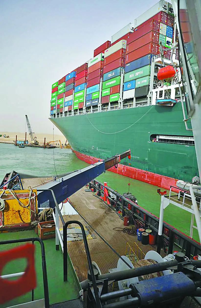 图说:当地时间25日,多艘拖船正努力对“长赐”号货轮进行救援。