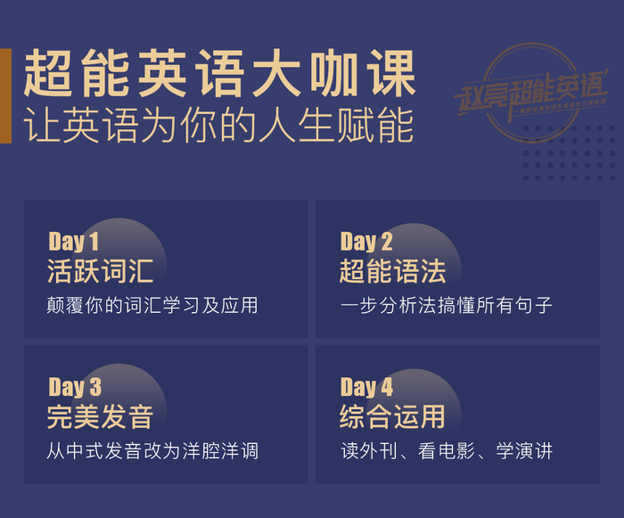他刷数遍《Oxford Online English》《TED》《BBC》等经典实用剧,总结单词、语法、发音、实用4块系统精华,收获上万学子好评,无数人摆脱英语恐惧,掌握流利英语惊艳朋友圈,现在,老师专门开设了4天超能英语训练营
