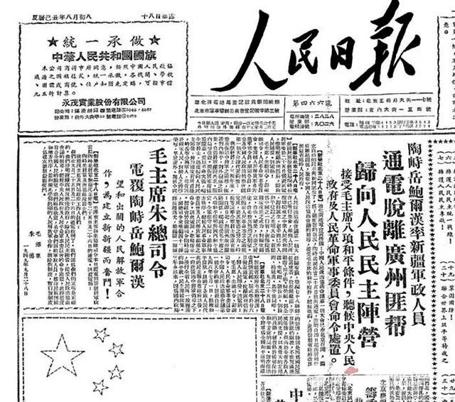 1949年9月29日,人民日报一版刊发陶峙岳、包尔汉通电起义消息和毛主席、朱总司令复电。