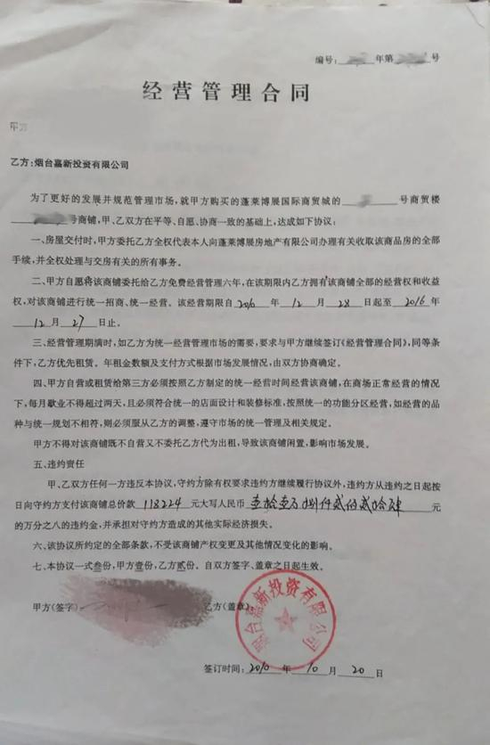 租金承诺同样没有体现在已经交付的1期项目上,“买房前售后返租的承诺也是到最近两年才开始兑现,但租金收益远低于正常市场标准。”购买了1期项目的业主李海告诉记者,现在商家每年向房东支付三千元左右的房租,再向山东名嘉交4000多元的物业费,“这是变相的拿物业费代替租金” 。