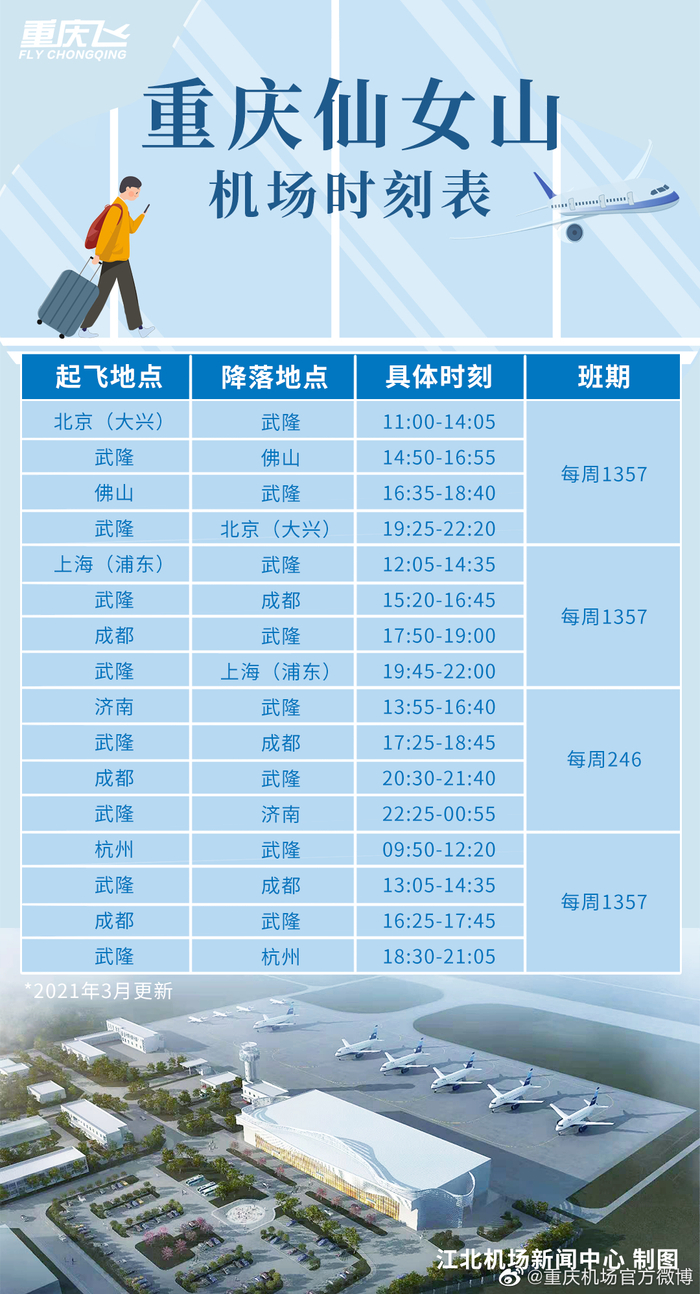 仙女山机场相关负责人介绍,在今日3条航线开通后,3月30日,仙女山机场还将开通济南-武隆-成都航线,后续还将陆续开通仙女山机场至重庆、西安、合肥、贵阳、温州、长沙等地的航线。
