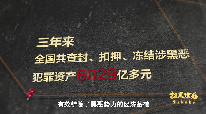 三年来,“打财断血”总体战果显著,全国共查封、扣押、冻结涉黑恶犯罪资产6029亿多元,有效铲除了黑恶势力的经济基础。