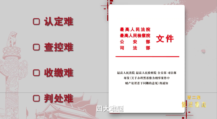 如何依法认定涉案资产,成为办理此案的最大难点。针对办案实践中“黑财”认定难、查控难、收缴难、判处难的问题,在全国扫黑办的推动下,最高人民法院、最高人民检察院、公安部、司法部在2019年4月,联合印发了《关于办理黑恶势力刑事案件中财产处置若干问题的意见》,为解决涉黑涉恶财产处置的四大难题提供了明确的标准与依据。