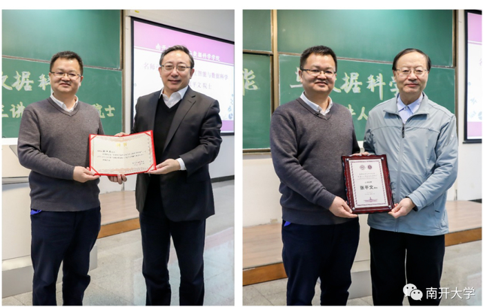 曹雪涛院士向张平文院士致送“南开大学通识教育课程特聘教师”聘书,马志明院士向张平文院士致送“南开大学名师引领通识课‘走进人工智能与数据科学’主讲教师”纪念牌。