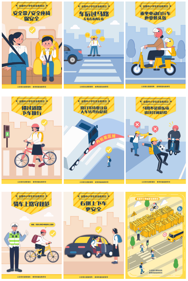 2021年,公安部交通管理局联合教育部基础教育司设计下发9张安全提示海报,并筹备录制“知危险会避险”交通安全体验课。体验课将于3月28日19时30分至20时30分通过央视频、央视少儿频道官方新媒体账号,“公安部交通管理局”微博账号、视频号,未来网等进行直播。直播课当天,敬请广大中小学生及其监护人收看。
