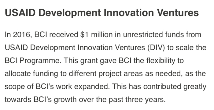 BCI的官网里有一个他们发展壮大的故事,里面写着:2016年,BCI收到了美国国际开发署100 万美元的资金资助。而且这笔资金还是不限制用途的( unrestricted funds)。BCI自己介绍称,这极大地促进了BCI在过去三年的发展。
