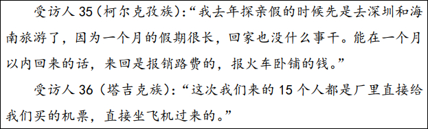 由此可以看出,新疆少数民族群众出疆务工完全是自主选择;平等就业、劳动报酬、节假日休假、休息日休假等劳动权利都得到了充分保障;饮食习惯、子女教育、探亲休假和往返交通等方面得到了更多照顾。