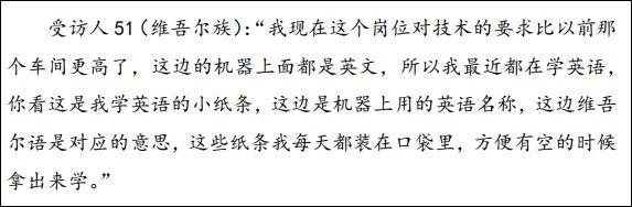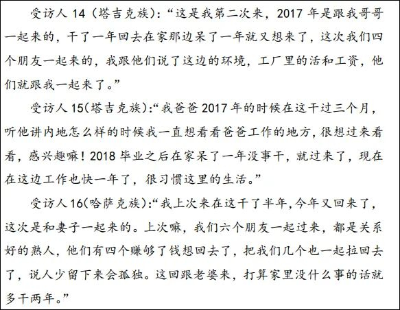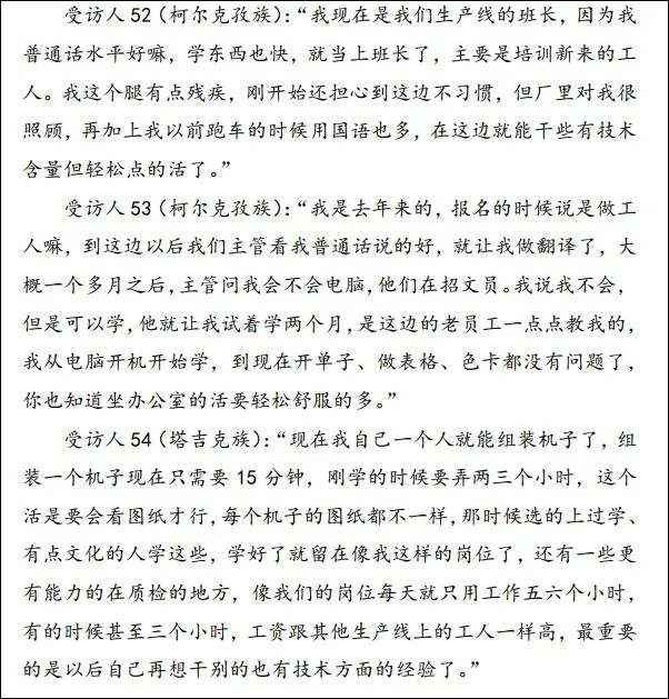 两人通过焦点小组访谈、深度访谈、参与式观察等研究方法,对广东省内5家聘用新疆少数民族工人的企业开展调查,其中2家正是“ASPI报告”中所提及的企业。参与具体访谈的包括维吾尔族、哈萨克族、柯尔克孜族、塔吉克族等在内的新疆少数民族务工人员共计70人,可谓十分细致全面。