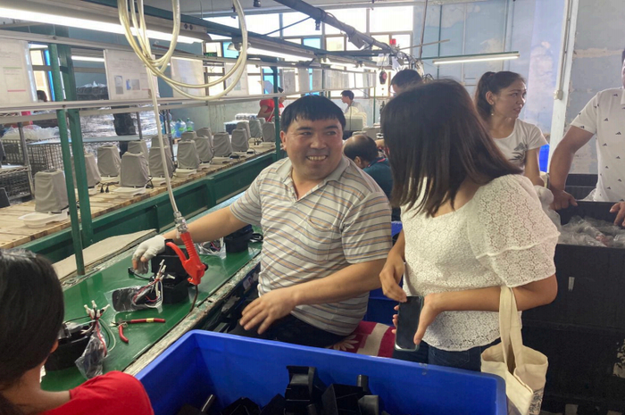 研究报告作者与带着一家5口人来广东打工的新疆柯尔克孜族工人(中间男子)在车间访谈 图自报告