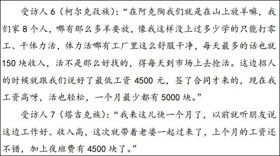 因此,两位新疆姑娘的报告得出结论:新疆少数民族群众在内地企业务工的任何一个环节都不存在“ASPI报告”中所提出的“再教育“、“强迫劳动”和“监视”。而一些国家以所谓“强迫劳动”为借口对这些雇佣新疆少数民族工人的企业进行制裁,实际上是打着“人权”的旗号损害新疆各族人民正常工作的权利。