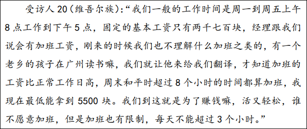 尼罗拜尔和陈宁的调研报告显示,在内地务工的新疆少数民族工人每天正常的工作时间大多为8个小时(部分技术类岗位工作时间更短),分为白班和夜班两个班次,在企业订单较多时会在法律规定范围内有额外的加班,除了加班和夜班有额外的工资和补贴,技术类岗位也有绩效工资。
