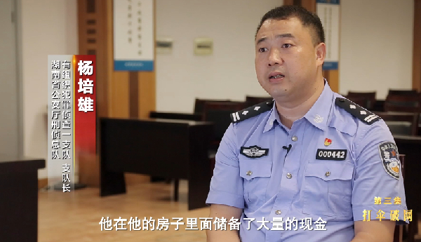 湖南省公安厅刑侦总队有组织犯罪侦查一支队支队长 杨培雄:他在房子里面储备了大量的现金,自己号称在长沙(晚上)12点钟以后到上班之前能够调动一个亿以上资金的他是第一人,所以他有长沙的“现金王”之称。