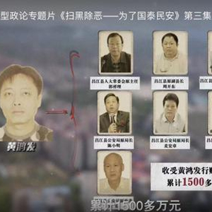 3月28日晚,由全国扫黑办与中央广播电视总台联合摄制的6集政论专题片《扫黑除恶——为了国泰民安》播出第三集《打伞破网》。专题片详细披露了海南黄鸿发涉黑案背后的“保护伞”、“关系网”:海南省昌江县人大常委会原主任郭祥理、昌江县原副县长周开东、昌江县人民检察院原检察长黄杨、昌江县公安局的原三任局长陈小明、麦宏章、王雄进、政委陈东等一批公职人员被相继拉下水,收受黄鸿发行贿钱物累计1500多万元。
