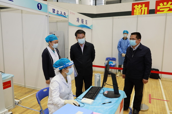 接种首日,校党委书记张京泽来到疫苗接种现场检查指导工作,看望前来进行核酸检测、疫苗接种的同学们,以及现场的医务工作者和组织保障人员,确保相关工作安全有序开展。
