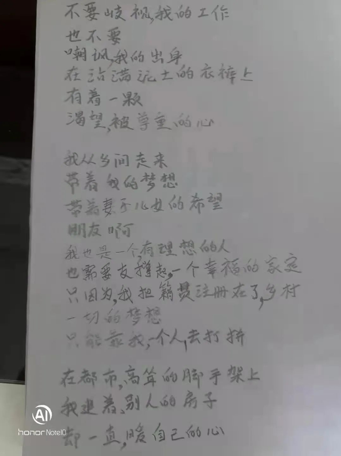 “请人们不要歧视我的工作,也不要嘲讽我的出身,在沾满泥土的衣裤上,有一颗渴望被尊重的心。”这首叫做《农民工》的诗,是李英明所创作诗歌中特别重要的一类,也就是描摹农民工内心世界的题材,诗歌中饱含着农民工的心酸和对被看见的渴望。