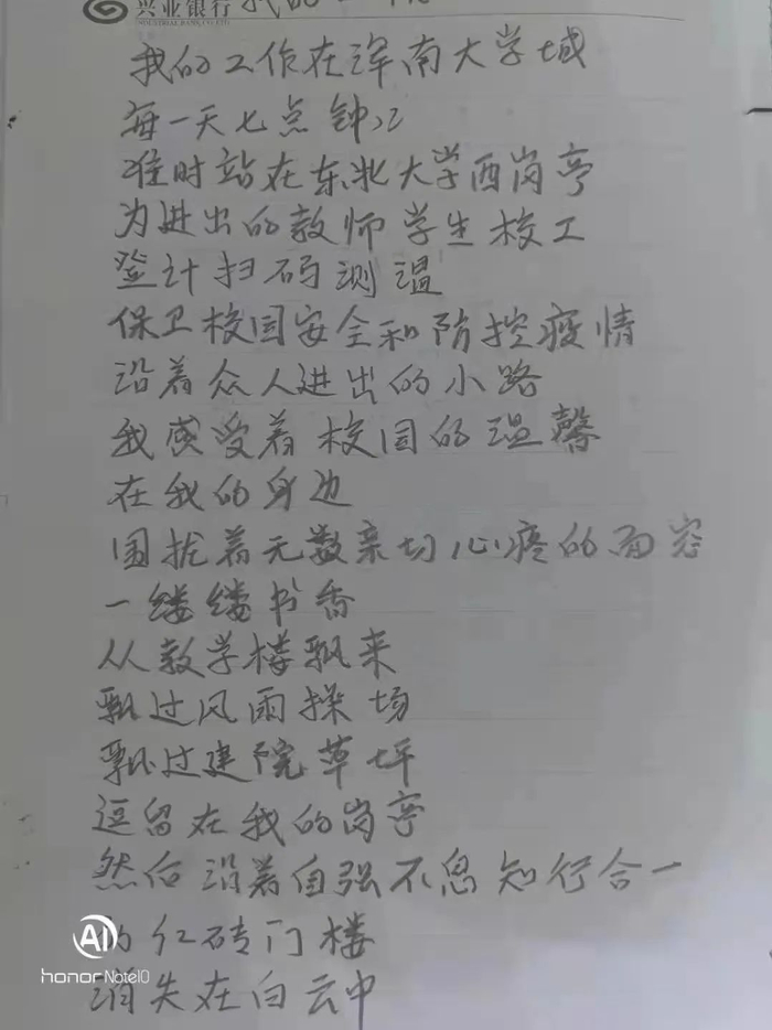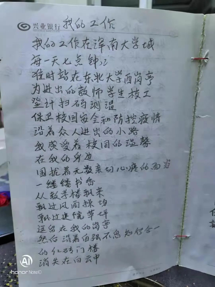 担任东北大学保安后,他和青年学子们打成一片,加入了学校的鼎原文学社,参加现场创作等赛诗活动,用温暖的文字鼓舞青年学子们热爱生活,追求理想。