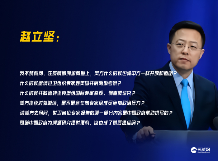 “我不禁要问,在疫情和溯源问题上,美方什么时候也像中方一样开放和透明?什么时候邀请世卫组织专家赴美国开展溯源考察?什么时候开放德特里克堡给国际专家参观、调查或研究?” 赵立坚说,美方连续对外喊话,是不是意在向专家组成员施加政治压力?“请美方去问问,世卫各位专家报告的哪一部分内容是中国政府帮助撰写的?难道中国政府为溯源研究提供便利,这也成了幕后操纵吗?”