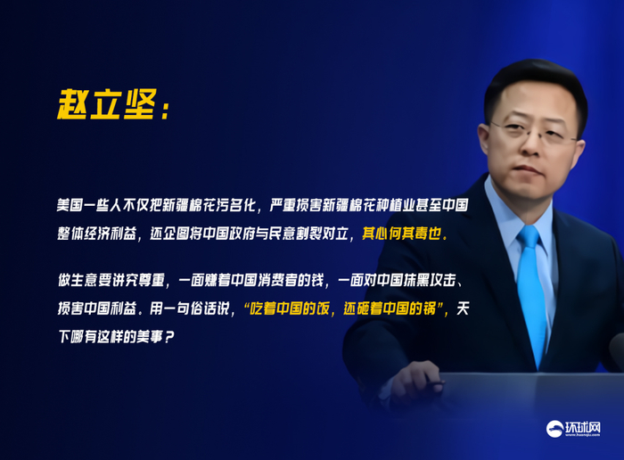 回到新疆棉花的话题,赵立坚强调,做生意要讲究尊重,一面赚着中国消费者的钱,一面对中国抹黑攻击、损害中国利益。用一句俗话说,“吃着中国的饭,还砸着中国的锅”,天下哪有这样的美事?