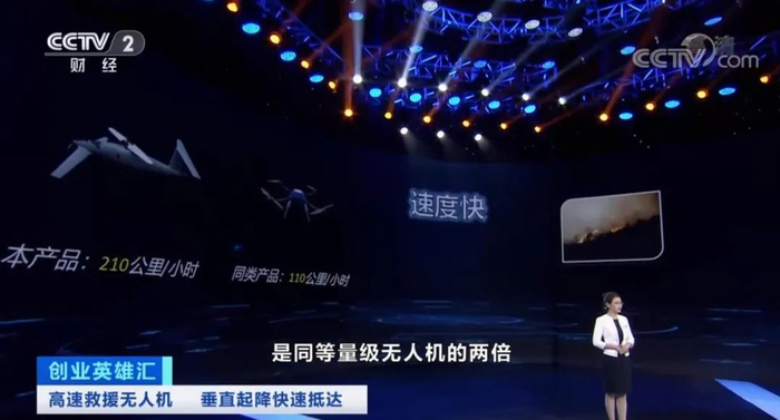 “有一项无人机技术,国内外都在研究但多以失败告终,这项技术就是将旋转机翼和固定翼结合,让垂直起降类无人机可以高速飞行。”西北工业大学航空学院飞行器设计专业博士生张珊珊向节目现场投资人介绍道。