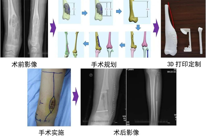 大连理工大学刘斌教授与辽宁省肿瘤医院商冠宁教授多次围绕手术方案及修复重建方式进行技术交流,最终,课题组利用人工智能技术进行病灶识别与提取,并应用3D打印技术进行个性化自体骨生物重建解剖学、生物力学模拟匹配,精准化模拟手术计划。在沈阳市东亚骨科研究所协助下,完成3D打印模型及精准化截骨导板设计,制定了周密的手术方案流程,顺利完成手术。术后六周复查,患者移植自体骨愈合良好,供区腓骨再生确切,可负重行走。