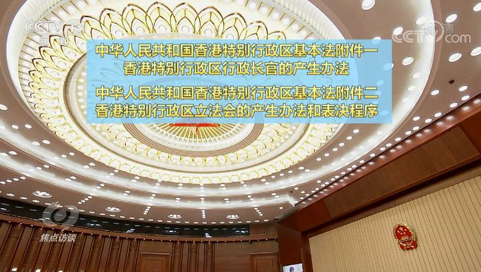 今年3月11日,十三届全国人大四次会议通过了《全国人民代表大会关于完善香港特别行政区选举制度的决定》。该决定规定了香港特别行政区选举制度的基本原则和核心要素,其中第六条授权全国人大常委会修改香港特别行政区基本法附件一和附件二。3月30日,全国人大常委会通过两个新修订的附件,就是对全国人大有关决定内容的全面展开和具体落实。这两个附件分别是《香港特别行政区行政长官的产生办法》和《香港特别行政区立法会的产生办法和表决程序》。
