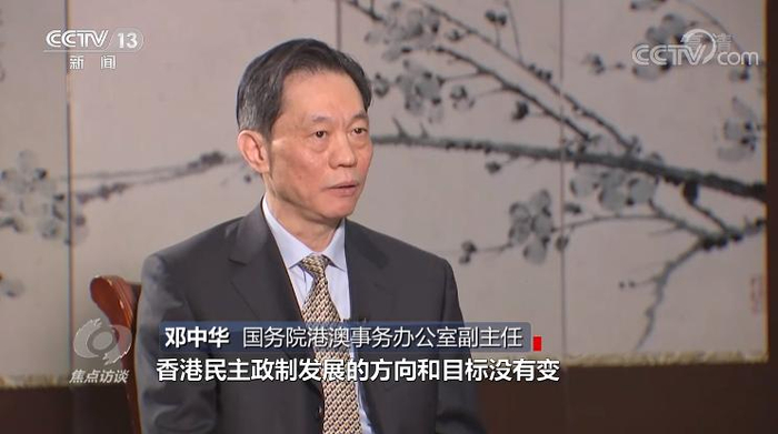 国务院港澳事务办公室副主任 邓中华:发展香港的民主制度决不能背离,“爱国者治港”这一根本原则,这次全国人大及其常委会,修改完善香港特别行政区选举制度,就是要将“爱国者治港”,这一根本原则法律化、制度化。