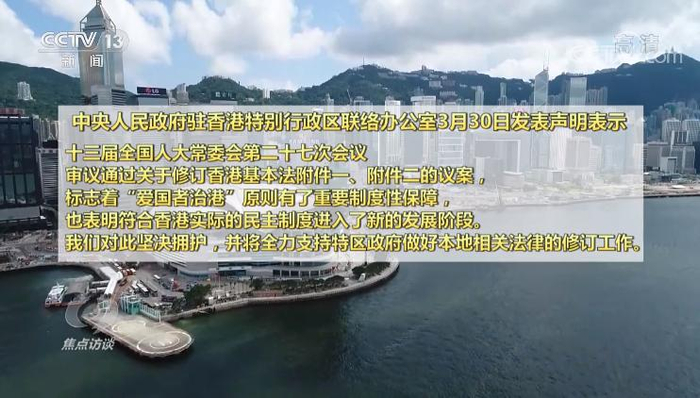 中央人民政府驻香港特别行政区联络办公室3月30日发表声明表示,十三届全国人大常委会第二十七次会议审议通过关于修订香港基本法附件一、附件二的议案,标志着“爱国者治港”原则有了重要制度性保障,也表明符合香港实际的民主制度进入了新的发展阶段。我们对此坚决拥护,并将全力支持特区政府做好本地相关法律的修订工作。