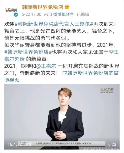 不过,香港《星岛日报》29日注意到,上个星期刚开始担任新世界代言人的王嘉尔,其代言照及官宣视频已经在这家免税店各社交平台账号的历史动态中查找不到,除了新世界微博账号仍保留有王嘉尔的宣传视频外。