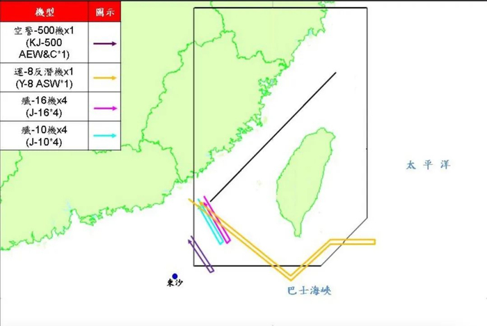 台湾地区防务部门也在其官网的“即时军事动态专栏”中通报了解放军军机今日的活动。通报指出,今天进入台湾省“西南防空识别区”的解放军军机,包括一架空警-500预警机、一架运-8反潜机、四架歼-16战机、四架歼-10战机,共计10架军机。根据台当局“国防部”公布的大陆军机航迹图显示,其中一架运-8反潜机甚至穿出巴士海峡深入到台湾省的东部空域。台湾地区防务部门称,台军空军采取了包括派遣空中巡逻兵力应对、广播驱离、地空导弹监控等方式应对。
