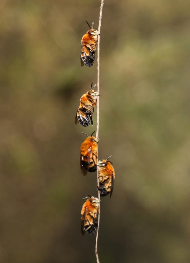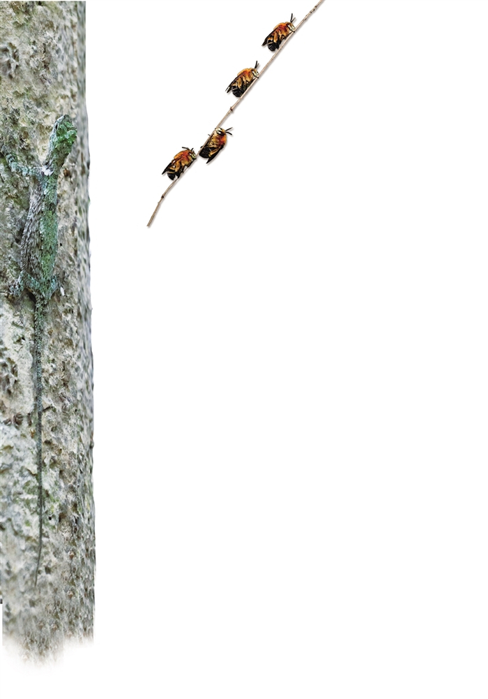 ❷五指山热带雨林里的无垫蜂用大颚咬住植物的枝条入睡。