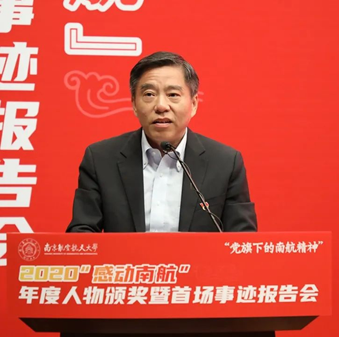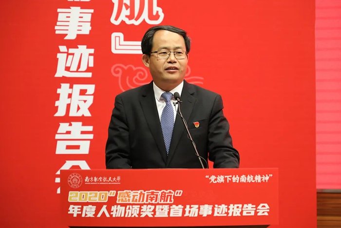单忠德代表学校对2020“感动南航”年度人物获奖者表示热烈祝贺,对他们在平凡的岗位上创造了不平凡的业绩表示崇高敬意。他表示,此次报告会不仅是对我校师生精神面貌和奋斗风采的生动展示,更是创造性开展党史学习教育,以身边人、身边事诠释学史明理,学史增信,学史崇德,学史力行的重要举措。他希望广大南航师生以年度人物为榜样,从他们高尚追求中汲取奋斗的力量,从他们奋力拼搏中磨砺坚毅品质,从他们无私奉献中升华思想,勇于成为新时代加快世界一流大学建设者、贡献者。