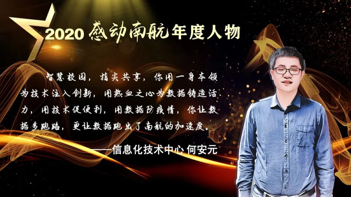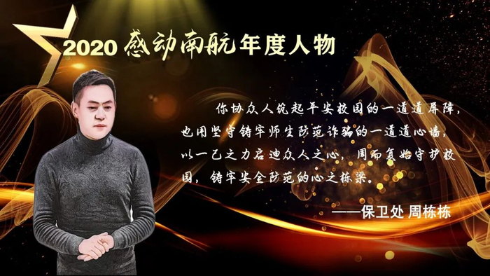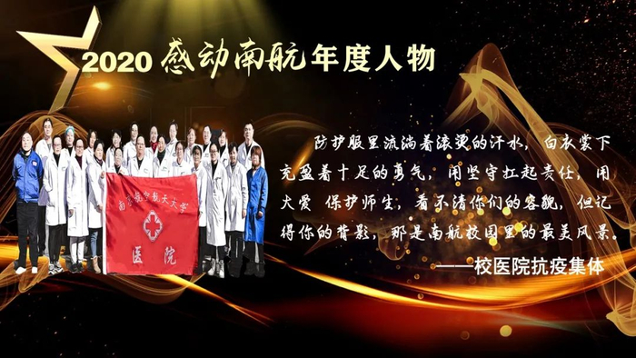 2020“感动南航”年度人物计算机科学与技术学院/人工智能学院副教授袁伟伟、信息化技术中心系统资源部主任何安元、保卫处治安管理科科长周栋栋、“为生命奔跑”团队、校医院抗疫集体共同演绎了诗朗诵《平安航向,校园担当》,讲述了在危急时刻共同救助学生、疫情期间共同保卫校园的故事。