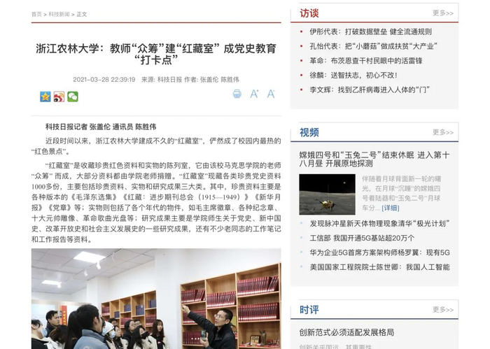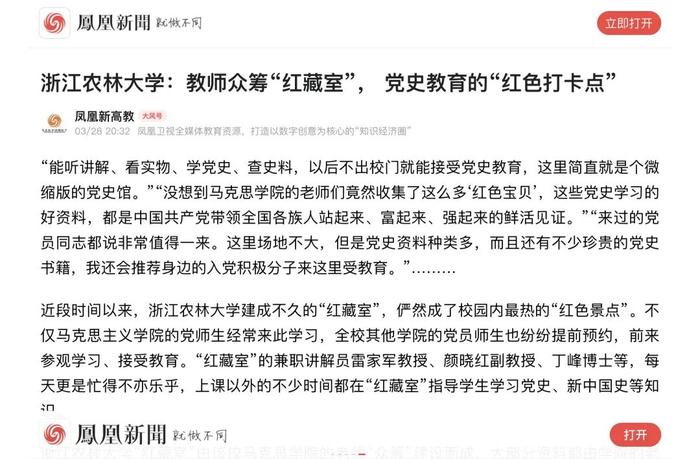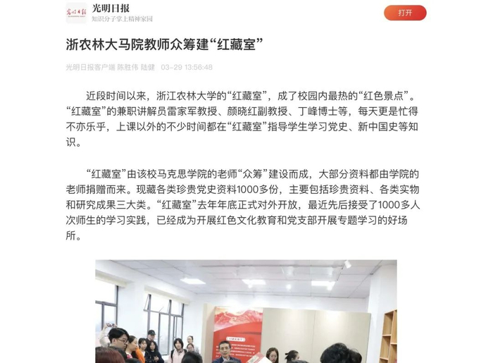 浙江农林大学马克思主义学院还与杭州市临安区等地的党史研究室签订协议,通过联合采访建国前参加革命工作的老党员,记录他们在革命、建设、改革过程中不同人生阶段的典型故事;面向关老同志收集、征集他们的工作笔记、工作报告、奖章证章和其他有纪念意义的物品;组织师生挖掘、整理和研究乡村红色文化资源,深化学生的“三农”情怀教育……相关活动成果也将进一步充实“红藏室”,供全校师生党员学习、参观和研究,成为全校师生开展“四史”教育以及思想政治理论课的鲜活教材。