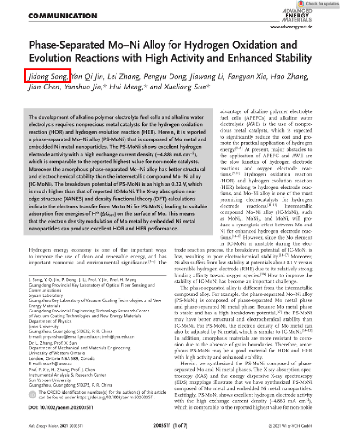 风雨过后终见彩虹。经历长达一年,反反复复地修改,宋吉东以第一作者身份在国际著名期刊Advanced Energy Materials (SCI1区,影响因子25.245)发表题为“Phase-separated Mo-Ni alloy for hydrogen oxidation and evolution reactions with high activity and enhanced stability”的学术论文(DOI: 10.1002/aenm.202003511)。理工学院物理学系金彦烁博士是论文的指导老师,他与物理学系副主任孟辉教授、我校讲座教授加拿大西安大略大学孙学良教授为该论文共同通讯作者。