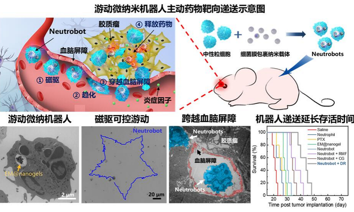 针对此难题,研究团队开发了一种基于体内免疫细胞的游动微纳米机器人(Neutrobot),这种游动微纳米机器人通过中性粒细胞吞噬大肠杆菌膜包裹的磁性载药水凝胶制备而成。该游动微纳米机器人可有效且稳定地携带紫杉醇等抗癌药物,依靠自主研发的控制系统将游动微纳米机器人引导到脑部区域,抵达脑胶质瘤区域的机器人可自主感知病原信号并穿越血脑屏障后游动到病患位点,将药物精准地释放到病患处,显著提高了药物的靶向效率。这些研究结果确立了基于免疫细胞的游动微纳米机器人作为一种潜在的脑胶质瘤精准疗法,用于系统性治疗胶质瘤。