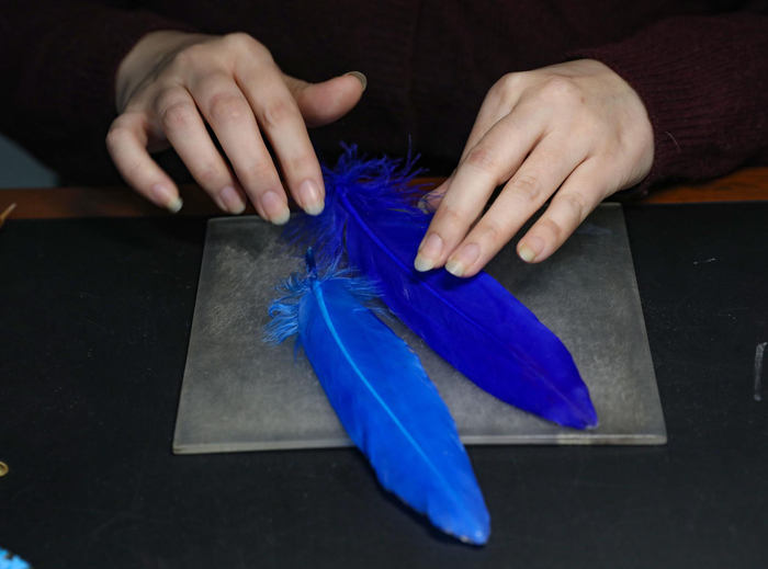 肖玉妹左手拿起一片染成蓝色的鹅毛,右手用剪刀顺着纹理剪下一小片,得出大概的花瓣状,再轻轻地捏着它,照着胎体比对,又继续修剪其细节。“翠羽必须和胎体完全符合,不大不小才好看。”