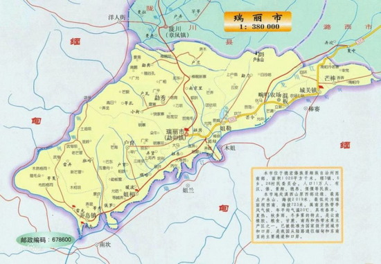 (图说:图中蓝色区域为瑞丽市,其三面与缅甸相连。)