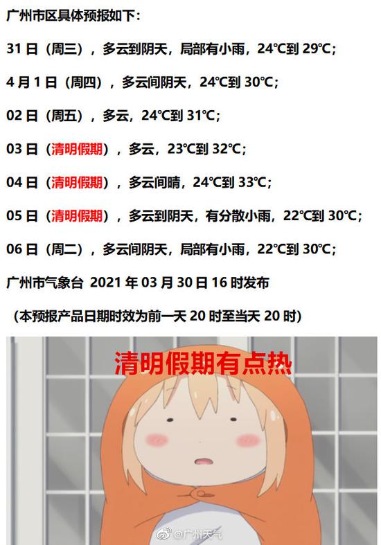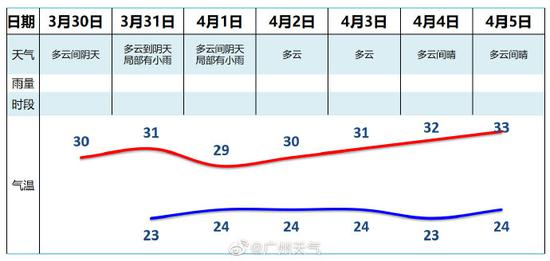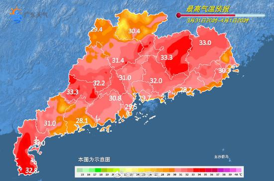 @广东天气 预计,31日-4月2日,广东省大部多云,部分市县最高气温可达33~35℃;大气较干燥,广东省森林火险气象风险等级高,注意用火安全。