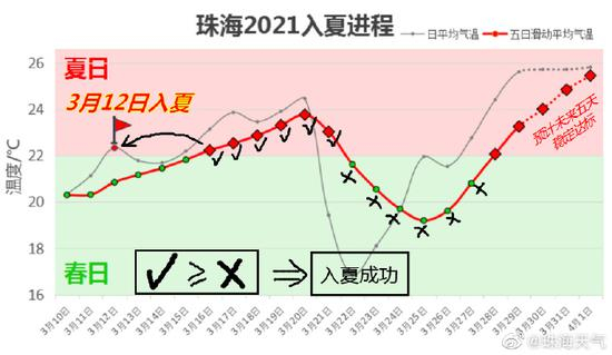 夏天真的来了!据@珠海天气 消息,3月16日开始,珠海已连续5组滑动五日日平均气温≥22℃,即使后续冷空气来了,但冷的时间太短,降温天数不足以压倒“夏天”日数。按“滑标”换季判定标准,冷空气未能阻断入夏,因此判定降温前首个日平均气温≥22℃的日子为入夏日,即3月12日入夏。