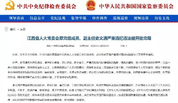 3月28日,中央纪委国家监委网站发布消息,江西省人大常委会原党组成员、副主任史文清严重违纪违法被开除党籍。通报提到,史文清“无视中央八项规定精神,劳民伤财搞形式主义,公款报销应由个人支付的费用,违规收受礼金”,作风败坏、影响恶劣。