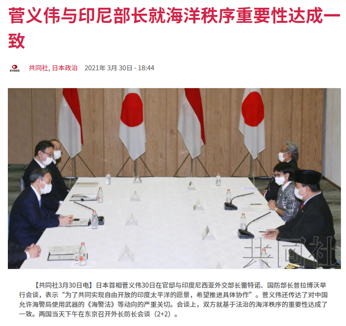 根据日本媒体3月31日的报道,日本和印尼两国的外长和防长在“2+2”会议后宣布,将加强两国之间在安全防御和海洋方面的合作,还声称要“共同面对中国日益增加的经济和军事实力”。