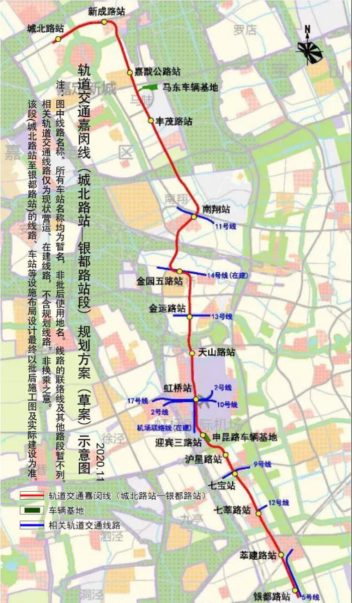 拟建中的嘉闵线(城北路站—银都路站段),线路总长约44.0公里(不含联络线)。线路起于城北路站,大体经胜竹路——澄浏中路——澄浏南路——宝翔路——丰翔路——佳通支路(现状)——沪宜公路——华翔路——曹安公路——黄家花园路——金运路——申昆路——七莘路——沪闵路至银都路站。