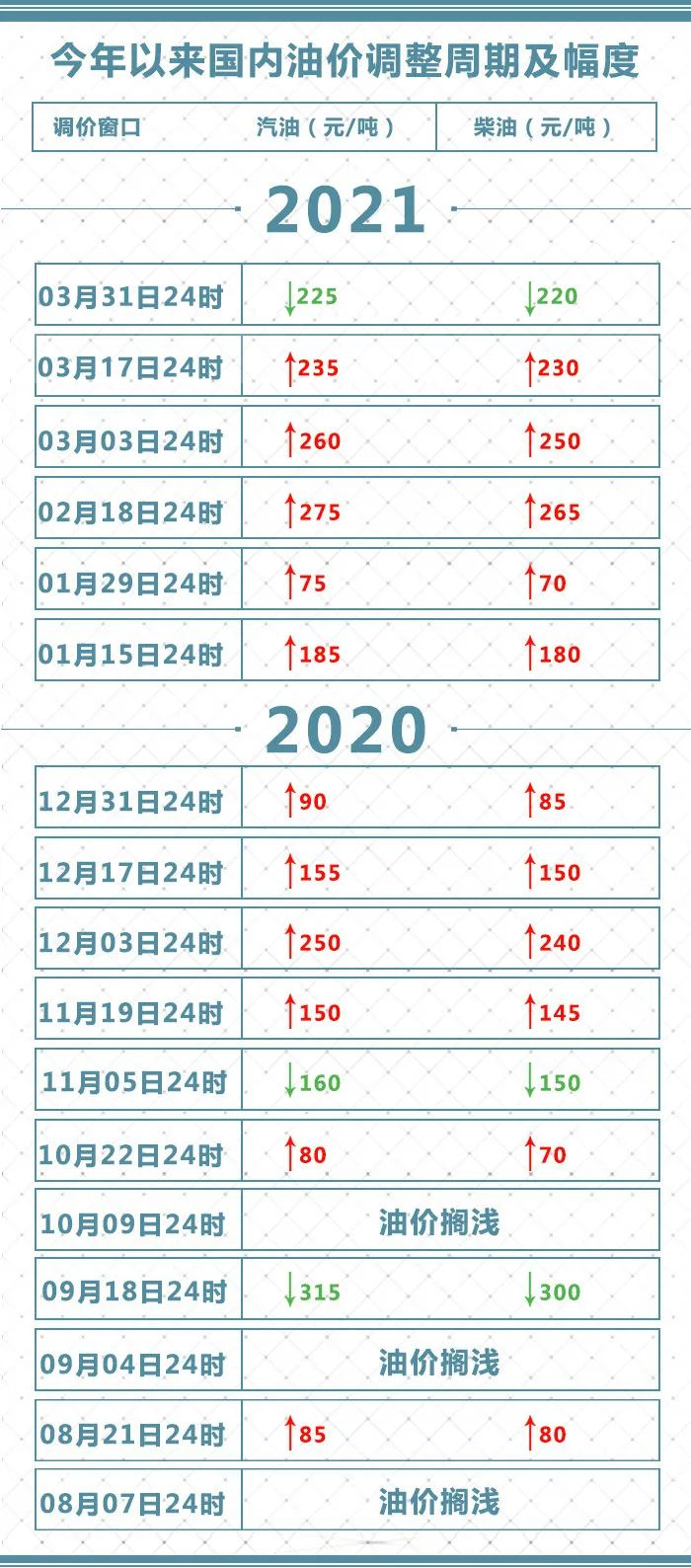 本次油价调整具体情况如下:汽油每吨下调225元,柴油每吨下调220元。