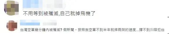 还有网友讽刺民进党当局,“不用等到被歼灭,自己就掉飞机了。”“台湾空军几分钟内被歼灭?假新闻。按照我空军不到半年就摔两架的速度……撑不到大陆‘犯台’”。↓