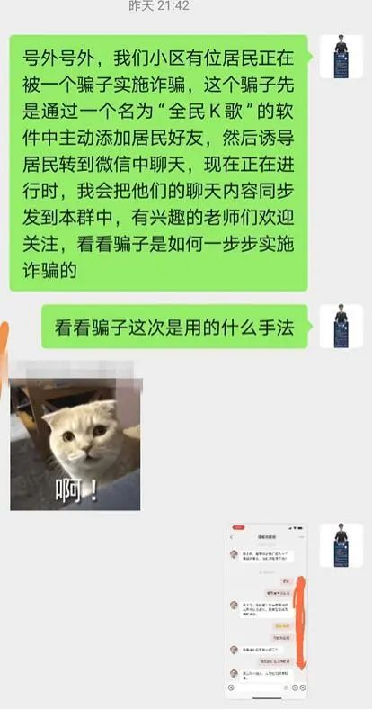“号外号外,我们小区有位居民正在被一个骗子实施诈骗,我会把他们的聊天记录同步发到群里,大家一起来看看骗子是如何一步步实施诈骗!”